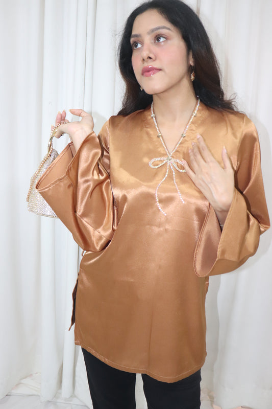 Haseena Kurti- golden short satin kurti with bow embroidery
