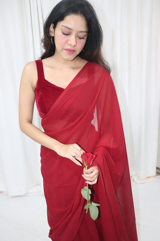 Gulab Saree- maroon georgette saree with velvet sleeveless blouse