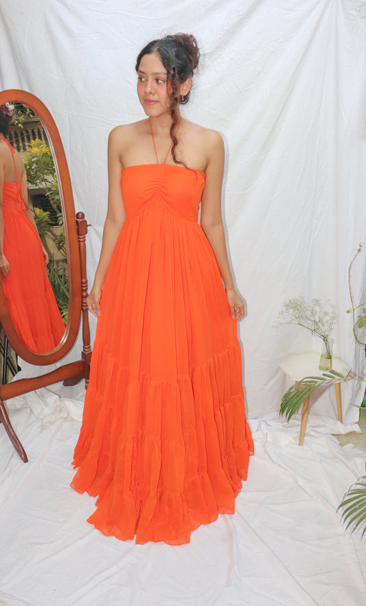 Sunset Dress- Orange Halter Maxi Flare Dress