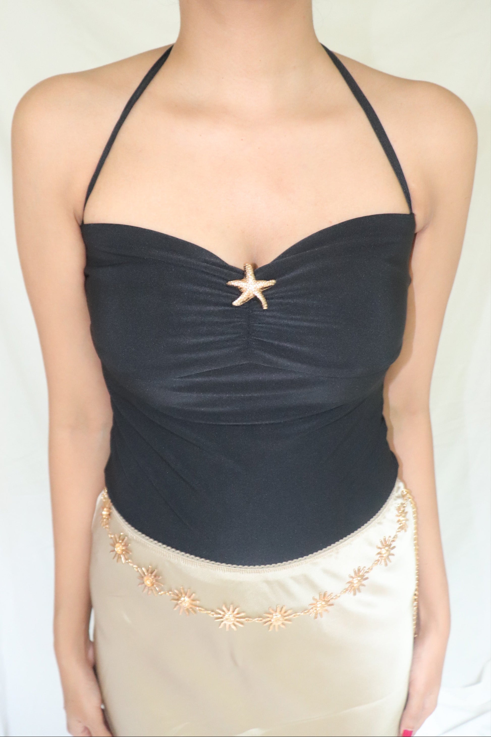 Dive into Mermaid vibes in our black halter strap top with starfish metal detailing. Wear it strapless or with straps for a versatile coastal mermaid look.